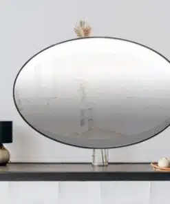 מראה עגולה קוטר ס"מ עם מסגרת שחורה דקה עשויה ממתכת אל חלד מותאם לחדר האמבטיה .
