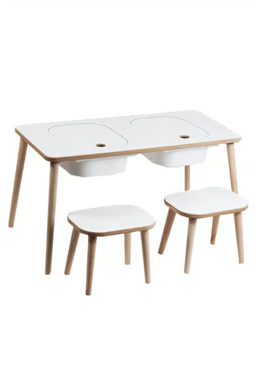 סט שולחן עם שני כסאות בסגנון שרפרף לילדים עם תאי אחסון נגישים בשליפה או בפתיחה מלמעלה . הסט עשוי מעץ מתועש עם חיפוי מלמין יצוק בצבע לבן משולב עם צבע עץ.