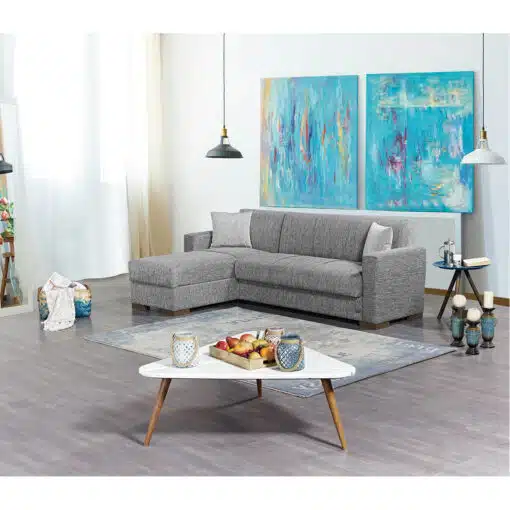 ספה פינתית נפתחת למיטה עם ארגז מצעים בבד אפור