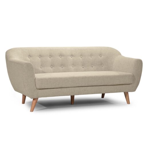 ספה תלת מושבית מעוצבת מרופדת בבד בז' חום בהיר חזק ונעים למגע, הספה מורפדת בספוג איכותי בצפיפות גבוה בדרגות קושי שונות להבטיח נוחות ועמידות מרבית, מסגרת הספה והרגליים עשויות מעץ מלא חזק ויציב. משענת הגב מעוצבת בסגנון קאפיטונאז.