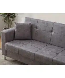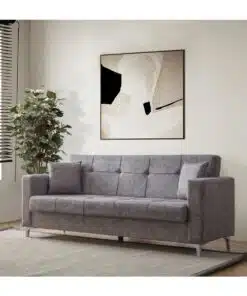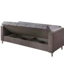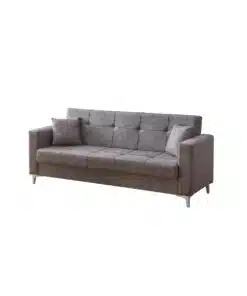 ספה נפתחת תלת מושבית מרופדת היטב בבד אפור איכותי עמיד וקל לניקוי וספוג איכותי בצפיפות גובה ודרגות קושי שונות להבטיח נוחות מרבית בשני המצבים. הספג מגיעה עם שני כריות נוי מתנה. לספה יש ארגז מצעים גדול לאחסון . הספה נפתחת בקלות ובמהירות למיטה , מסגרת הספה עשויה משבבית דחוסה ועץ מלא.