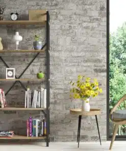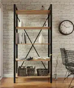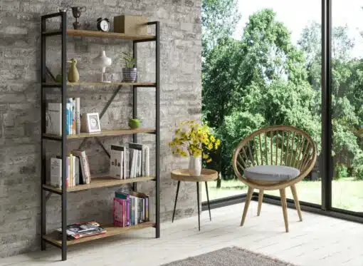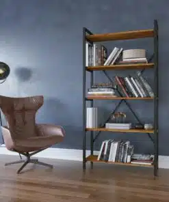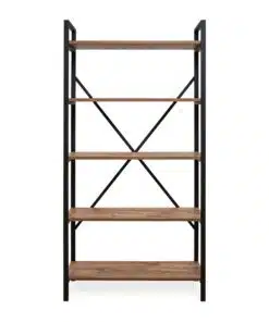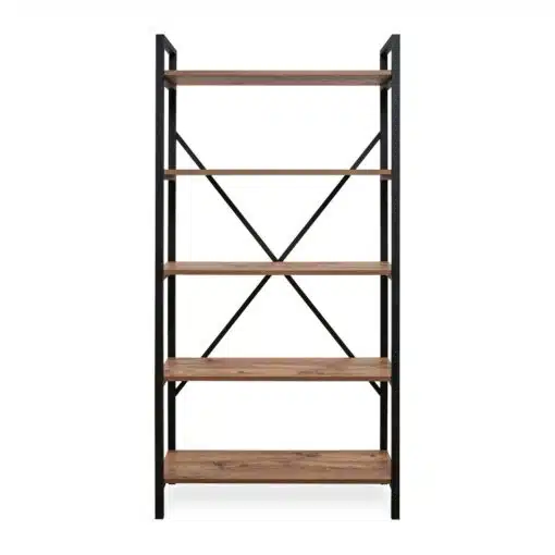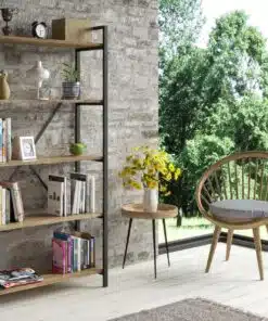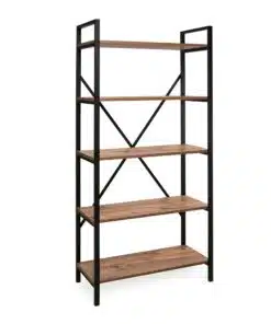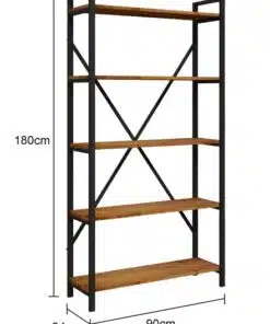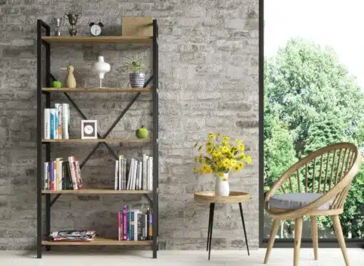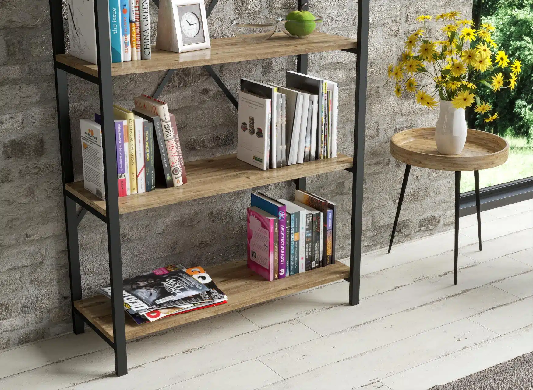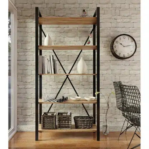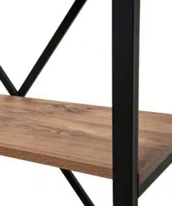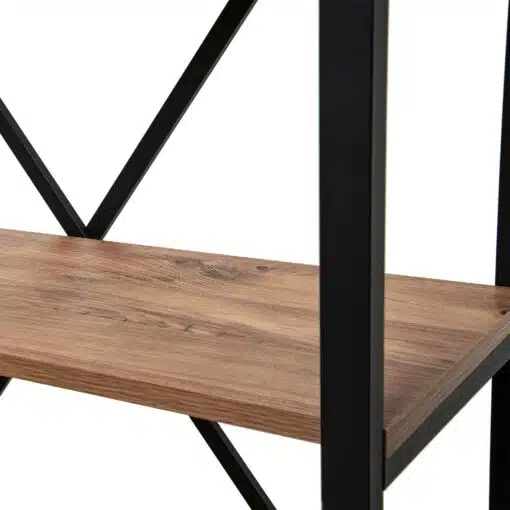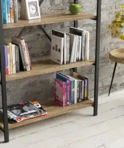 ספריית מדפים מעץ ומתכת . מסגרת הספרייה עשויה ממתכת אל חלד בצבע שחור , המדפים עשויים מעץ מתועש עם חיפוי מלמין איכותי ועמיד בגוון עץ טבעי.. הספרייה מוחזקת באמצעות מוטות תמיכה ומתאימה לאחסון ספרים והנחת דברי נוי.