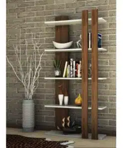 ספריית מדפים בעיצוב מיוחד ומודרני , בעלת 5 מדפים גדולים ומרווחים לאחסון. עשויה מעץ מתועש עם חיפוי מלמין איכותי משולב עם גוון עץ אגוז ולבן.
