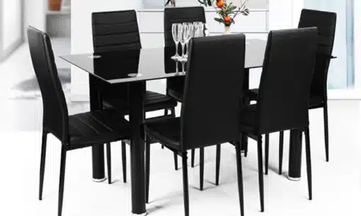 - עיצוב אלגנטי: הכיסאות בעלי המראה המודרני והרגליים המתכתיות השחורות משלימים את עיצוב השולחן, ויוצרים מראה אחיד ומלוכד.