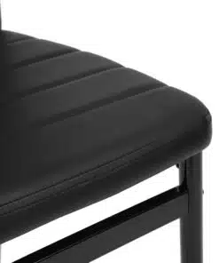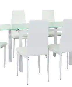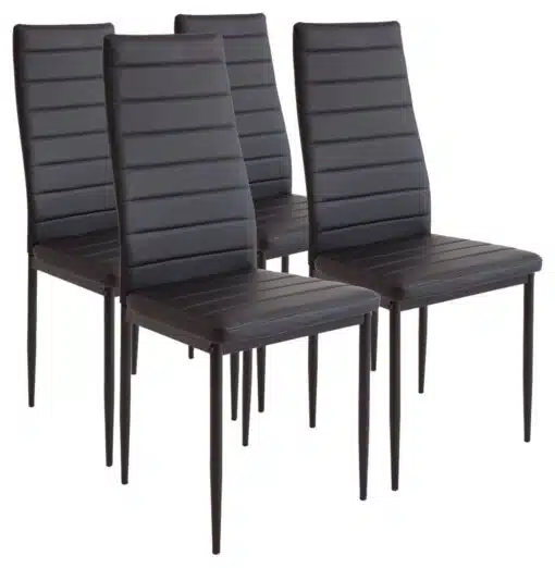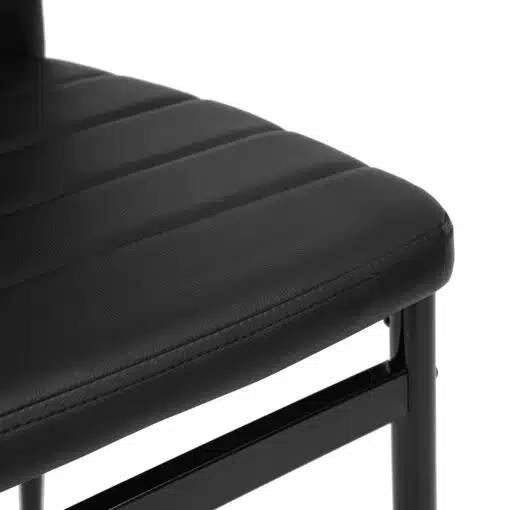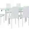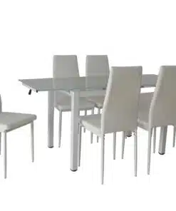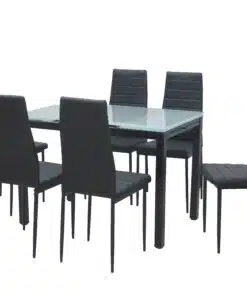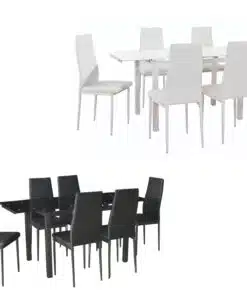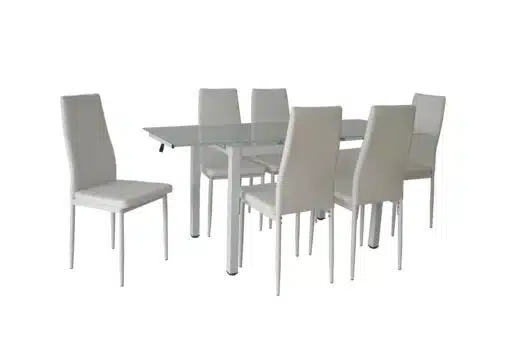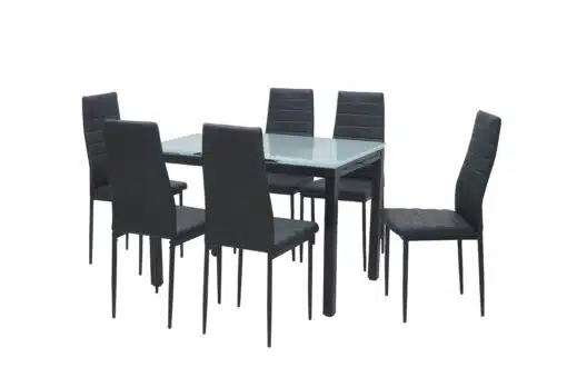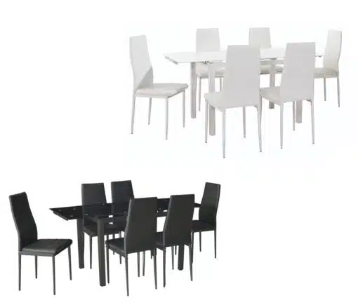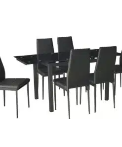 פינת אוכל נפתחת בעיצוב איטלקי מודרני עם שולחן מזכוכית שחורה וששה כסאות מהודרים בריפוד דמוי עור (PU leather) . פינת אוכל בעיצוב איטלקי מודרני עם שולחן משולב מתכת אל חלד בצע שחור וזכוכית שחורה מחוסמת בעובי 8 מ"מ. השולחן מגיע עם 6 כסאות מהודרים עם משענת גב גובהה מרופדים היטב בספוג איכותי ועמדי ודמוי עור איכותי חזק וקל לניקוי.