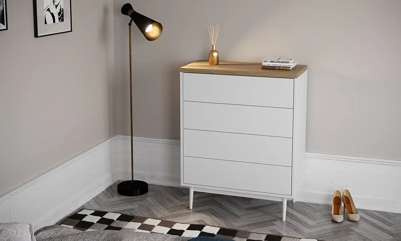 קומודה לחדר שינה בצבע לבן משולב אלון – פתרון אחסון אלגנטי ומעשי