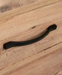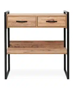 קונסולה צרה לכניסה לבית עם מגירות מדף אחסון תחתון,. עשויה מעץ מתועש עם חיפוי מלמין בגוון עץ אורון משולב עם מסגרת ממתכת אל חלד בצבע שחור. המגירות נעות בקלות על מסילות מתכת.