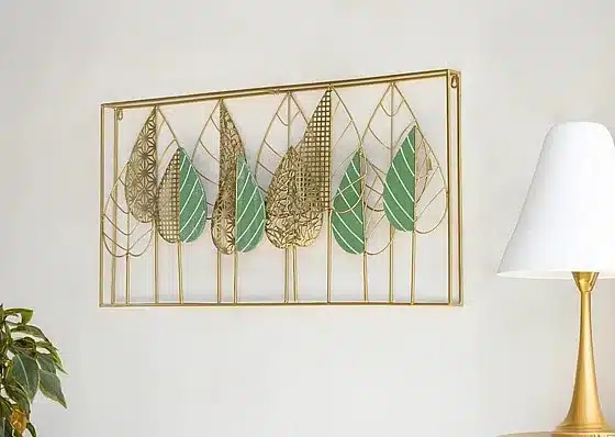 קישוט קיר מתכת בדגם עלה ירוק וזהב – עיצוב טבעי צבעוני