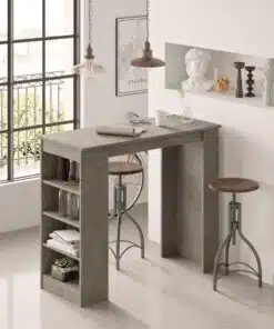 שולחן בר בצבע בטון עם מדפי אחסון ישתלב היטב במטבח. השולחן עשוי משבבית דחוסה עם חיפוי מלמין בעובי 18 מ"מ.