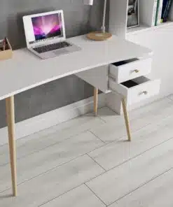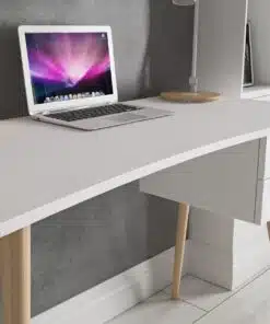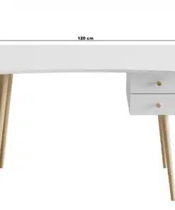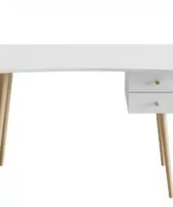 שולחן כתיבה קלאסי עם שני מגירות אחסון בצבע לבן משולב עם גוון עץ בהיר. השולחן עשוי מעץ מתועש עם חיפוי מלמין יצוק , המגירות נעות בקלילות על מסילות מתכת . שולחן פרקטי בעיצוב נקי ונעים , ישתלב היטב בבית או במשרד.