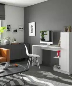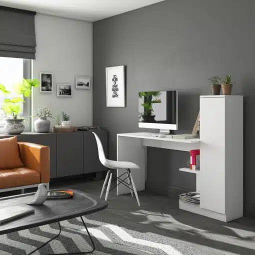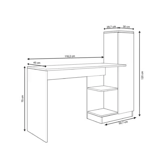 שולחן כתיבה עם מדפים וארונית אחסון . בארונית ישנם 4 מדפים נוחים לאחסון ושני מדפים פתוחים נוספים. השולחן עשוי מעץ מתועש עם חיפוי מלמין יצוק.