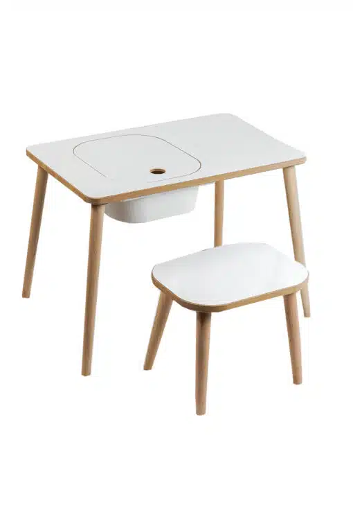 שולחן לילדים מעץ עם כיסא שרפרף .מתחת לשולחן ישנה מגירה לאחסון , המגירה נשלפת או נפתחת מלמעלה.