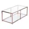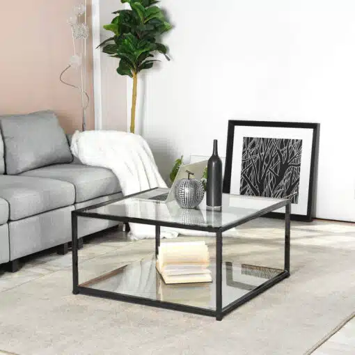 שולחן מרובע לסלון בעיצוב נקי וקווים ישרים , עשוי מזכוכית מחוסמת שקופה בגוון אפור עדין , מסגרת השולחן עשויה ממתכת אל חלד בצבע שחור.
