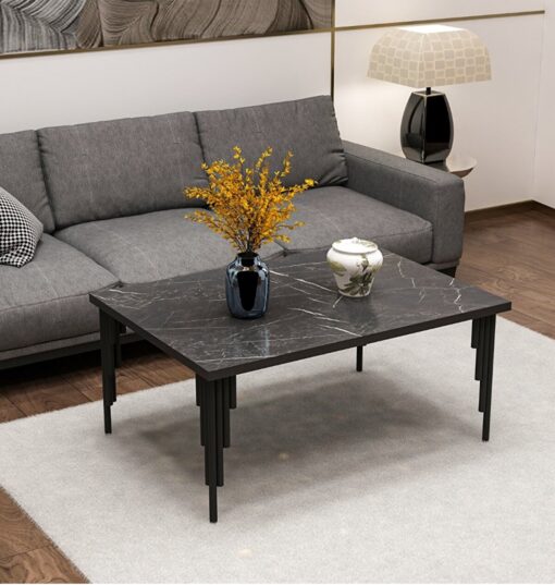 שולחן סלון דמוי שיש שחור עשוי מעץ מתועש עם חיפוי מלמין בגוון שחור עם גידים, רגלי ומסגרת השולחן עשויות ממתכת אל חלד בצבע שחור צבוע בצביעה אלקטרוסטטית איכותית . השולחן מעוצב בסגנון קלאסי וישתלב לצד מגוון רחב של עיצובים וסגנונות.