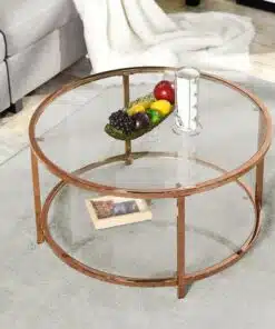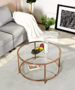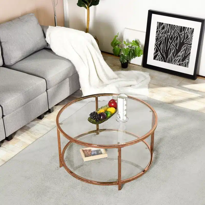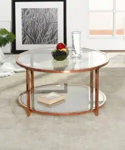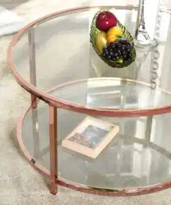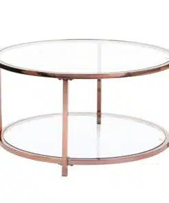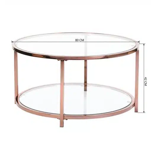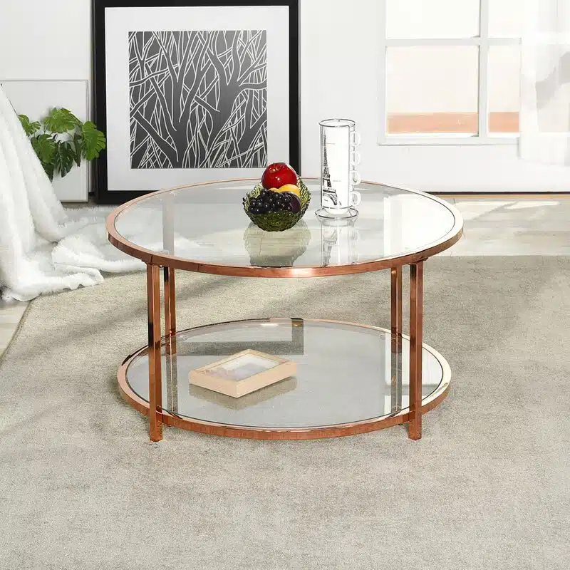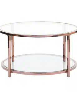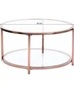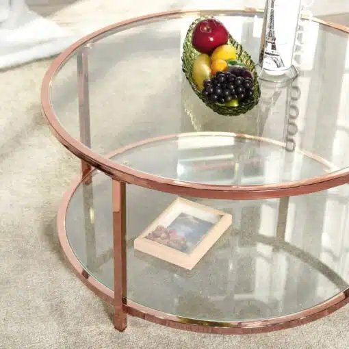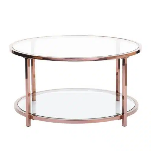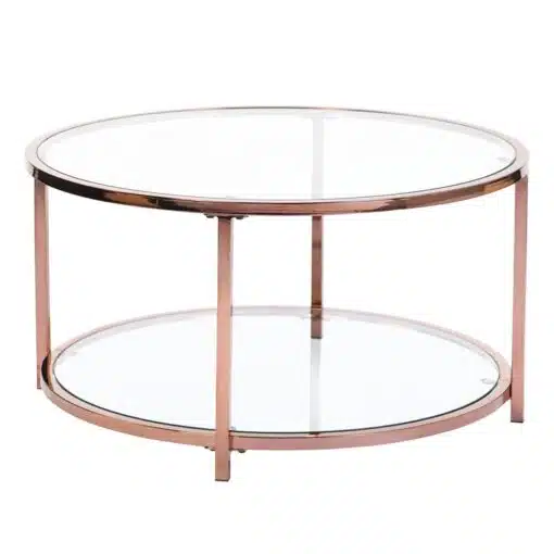 שולחן סלון עגול בעיצוב חדשני בשילוב יוקרתי של זכוכית ומתכת בצבע רוז גולד.