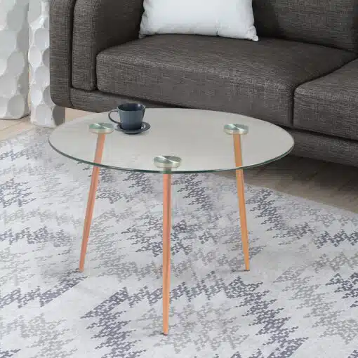 שולחן עגול לסלון מזכוכית מחוסמת בעובי 8 מ"מ. רגלי השולחן בגימור מוזהב מעט. השולחן מעוצב בסגנון מודרני .