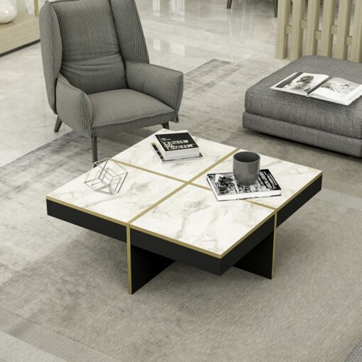 שולחן קפה דמוי שיש לבן משולב עם זהב בעיצוב יוקרתי עשוי מעץ מתועש עם חיפוי מלמין איכותי עמיד וקל לניקוי.