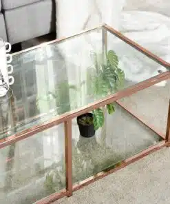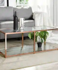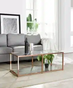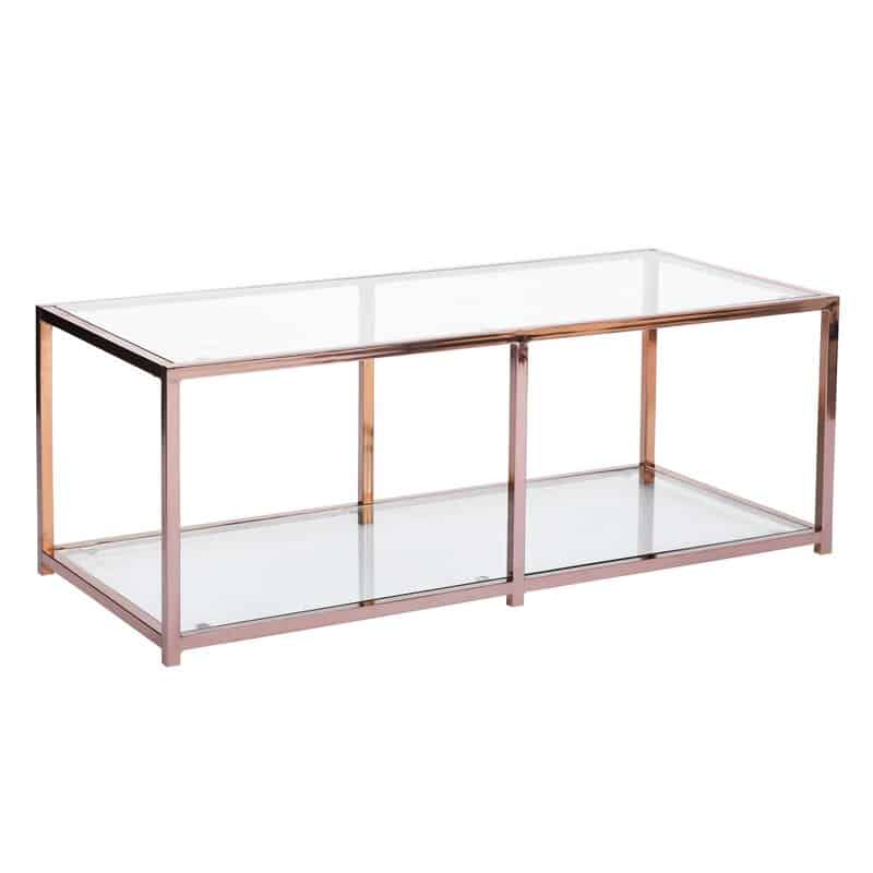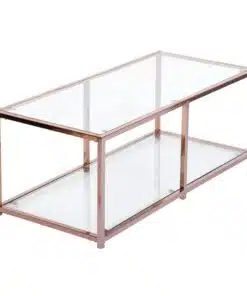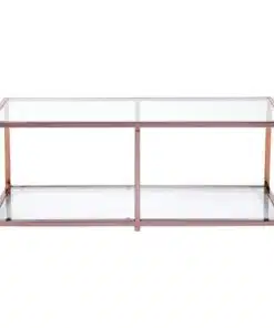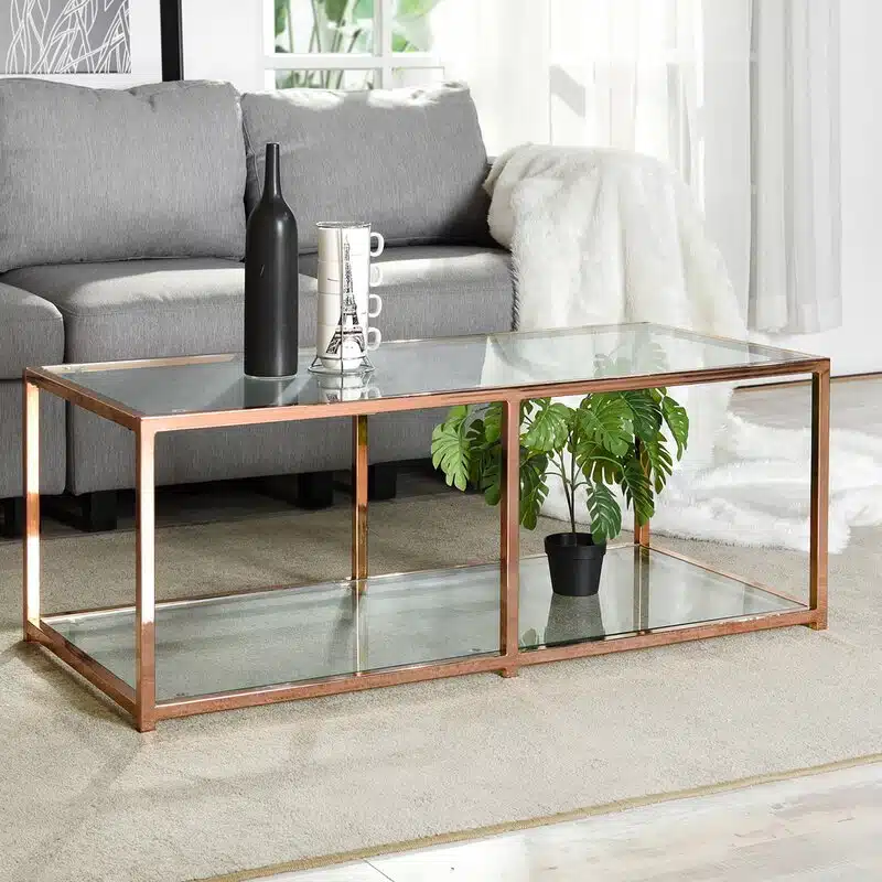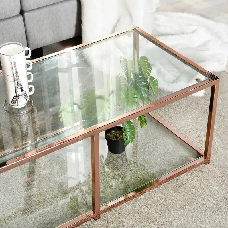 שולחן קפה מלבני מזכוכית בשילוב מתכת וזכוכית , פלטות הזכוכית עשויות מזכוכית מחוסמת , זכוכית השולחן שקופה בגוון אפור עדין. מסגרת השולחן עשויה מתכת אל חלד חזקה ויציבה בצביעה אלקטרוסטטית איכותית בצבע זהב זהב -רוז גולד