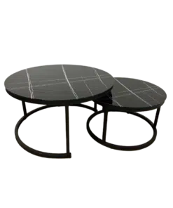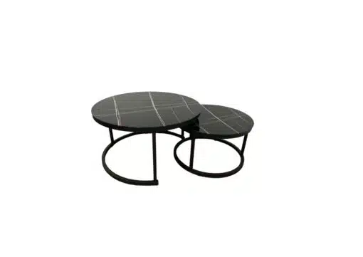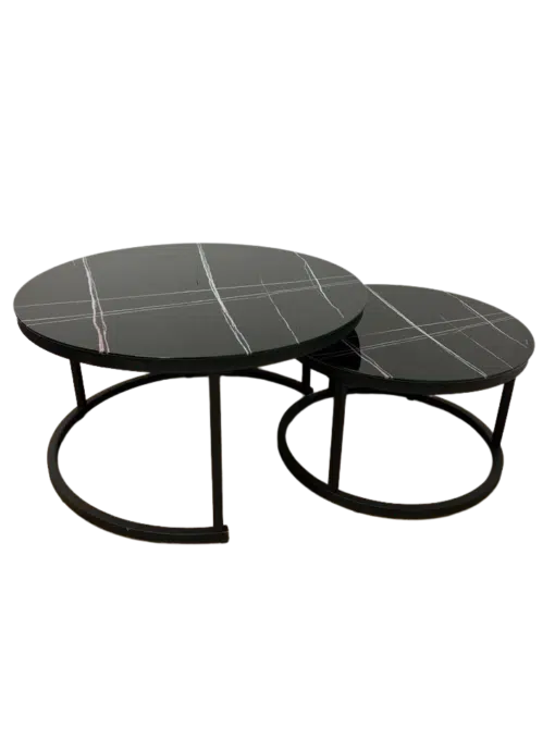 סט שולחנות עגולים לסלון בעיצוב יוקרתי , פלטת השולחנות עשויה מזכוכית מחוסמת איכותית בגימור שיש שחור עם גידים. מסגרת השולחן עשויה ממתכת אל חלד בצביעה אלקטרוסטטית איכותית בצבע שחור.