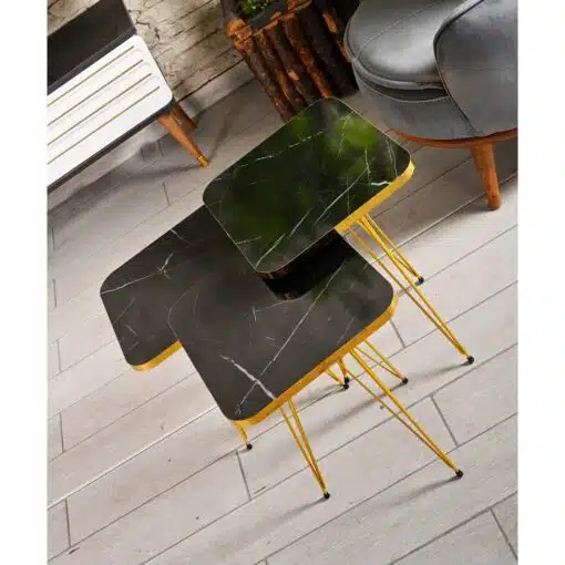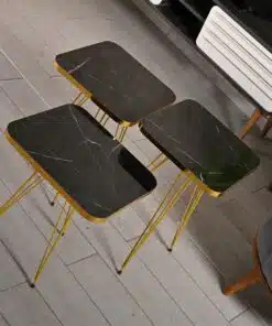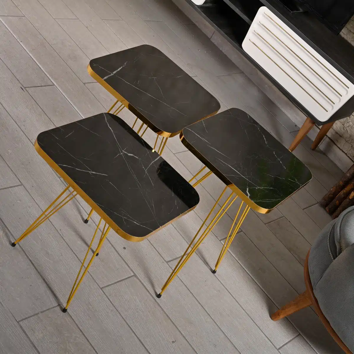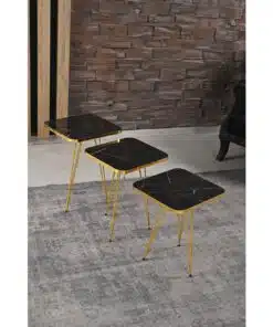 שולחנות צד לסלון עם פלטה דמוי שיש שחור ומסגרת מתכת בצבע זהב , פלטת השולחן עשויה ממתכת אל חלד בצבע זהב . השולחנות מעוצבים בסגנון קלאסי וישתלבו לצד מגוון רהיטים וסגנונות .