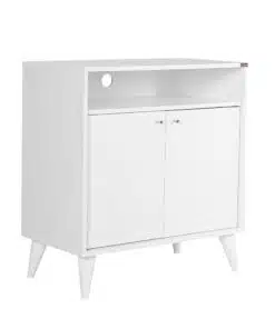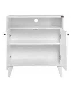 שידת לטלוויזיה בצבע לבן עם ארון מדפים סגור ומדף פתוח לממיר הכבלים, עשויה משבבית דחוסה בחיפוי מלמין איכותי בתקן אירופאי, כשידת טלוויזיה מתאימה למי שמחפש שידת טלוויזיה גובה יחסית, השידה מתאימה גם כשידת כניסה לבית.