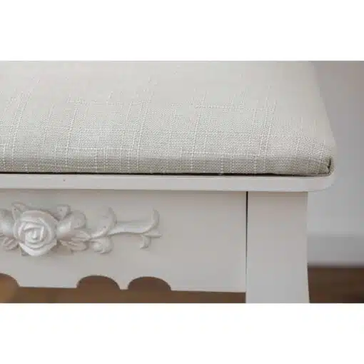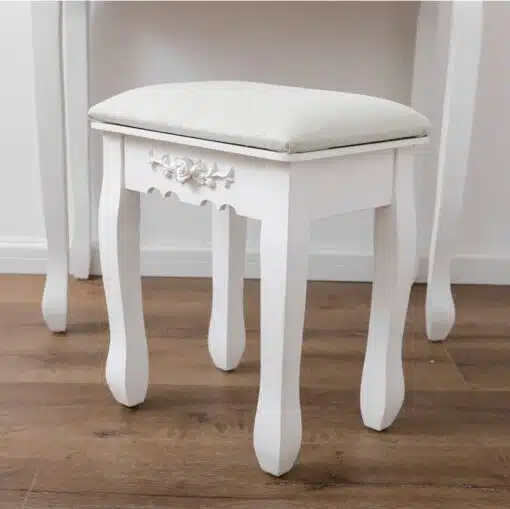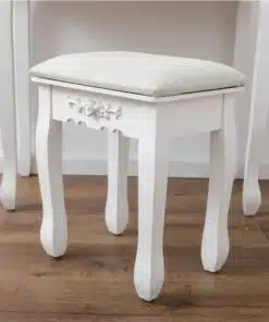 שידת איפר מעוצבת בסגנון פרובנס , השידה כולל כיסא הדום עם מושב מרופד בבד בצבע מוקה-בז איכותי עמיד וקל לניקוי. השידה כולל מגירות מעוטרות לתכשיטים איפור וחפצים שונים , המראה מתכווננת כך שתוכלי להתארגן בנוחות ובסטייל . השידה והדום עושיים מץ אורון משלוב עם אם די אף.