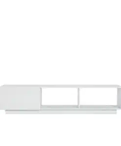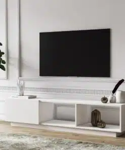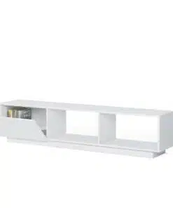 שידת טלוויזיה מעוצבת לסלון בצבע לבן עם 3 מדפי אחסון פתוחים בגב להשחלה קלה ונוחה של הכבלים , בצד אחד קלאפה נפתחת . המזנון עשוי משבבית דחוסה בעובי 18 מ"מ עם חיפוי מלמין יצוק בתו תקן אירופאי.