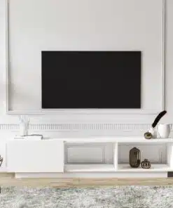 שידת טלוויזיה מעוצבת לסלון בצבע לבן עם 3 מדפי אחסון פתוחים בגב להשחלה קלה ונוחה של הכבלים , בצד אחד קלאפה נפתחת . המזנון עשוי משבבית דחוסה בעובי 18 מ"מ עם חיפוי מלמין יצוק בתו תקן אירופאי.