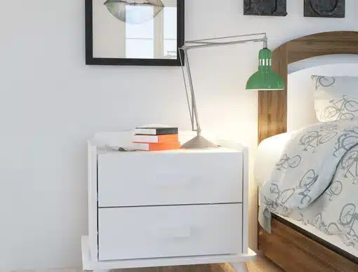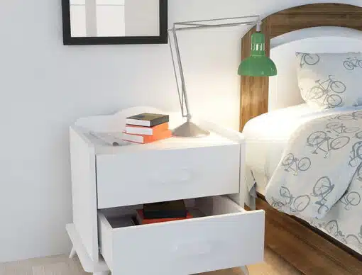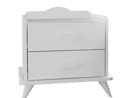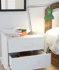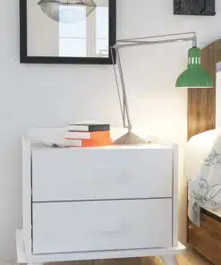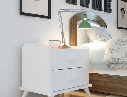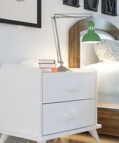 שידת לילה לבנה עם שני מגירות אחסון בעיצוב קלאסי ונקי . השידה עשויה משבבית דחוסה בחיפוי מלמין בצבע לבן.