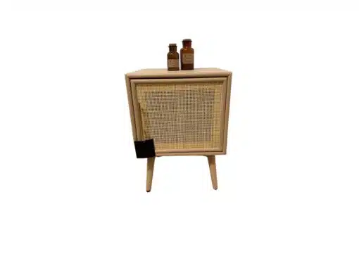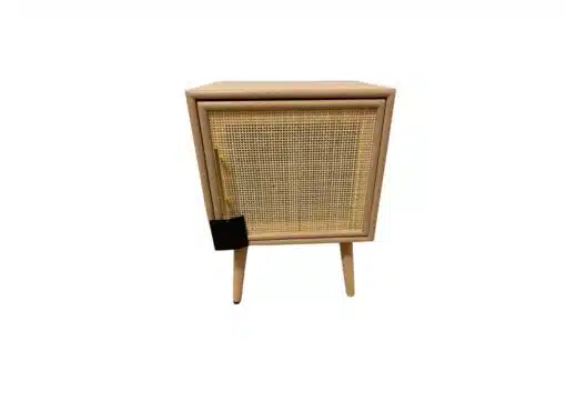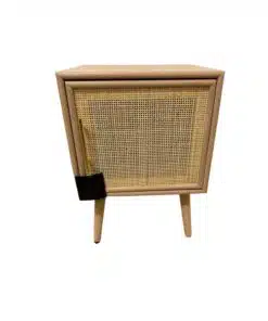 שידת צד מיטה בעיצוב כפרי בגימור עץ וראטן , עם ארונית אחסון גדולה ואחסון . השידה עשויה מאם די אף עם חיפוי מלמין יצוק בגימור משולב עם ראטן.