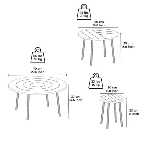 סט שולחנות קפה עגולים בגבהים וגדלים שונים. השולחנות עשוים משבבית דחוסה עפ חיפוי מלמין איכותי יצוק , מסגרת השולחן עשויה ממתכת אל חלד בצבע שחור .