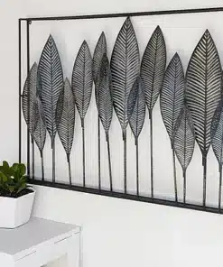 קישוט הקיר מתכת בדגם עלי ברוש פנורמה זמין בגוון שחור אלגנטי המתאים לכל סגנון עיצוב: