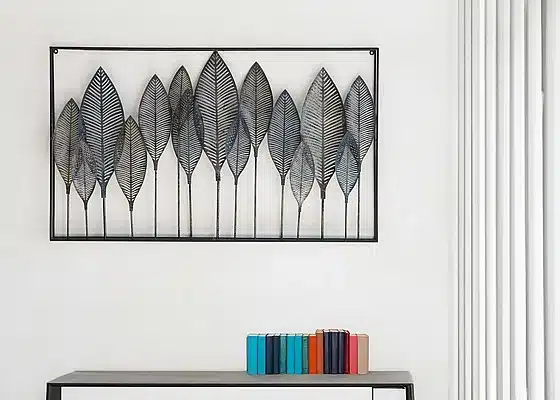 עיצוב פנורמי ייחודי: תבליט מתכת שחורה בדגם עלי ברוש. יצירה אומנותית המוסיפה טבעיות, עומק ויזואלי ואלגנטיות לקיר.