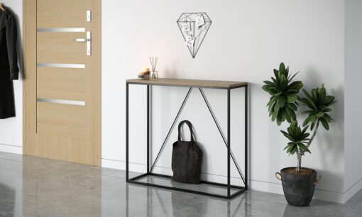 קונסלה רוחב 90 לכניסה לבית מעוצבת בסגנון קלאסי ותשתלב לצד סגנונות ועיצובים שונים, עשויה ממתכת אל חלד בצבע שחור ופלטה עשויה מעץ מתועש עם חיפוי מלמין יצוק.