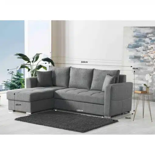 ספה פינתית נפתחת למיטה זוגית אם ארגז אחסון מצעים גדול . הסט מרופד היטב בגימור גבוה בבד איכותי עמיד וקל לניקוי , ספוג איכותי בצפיפות גבוה . מסגרת הספות עשויה מ- MDF מחוזק.