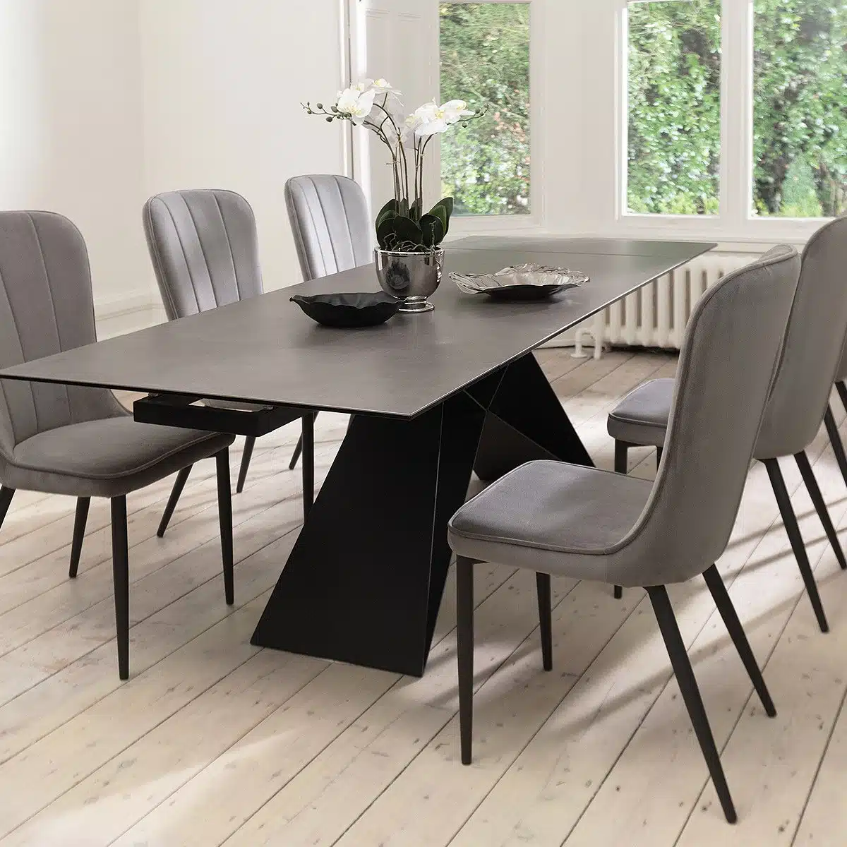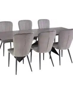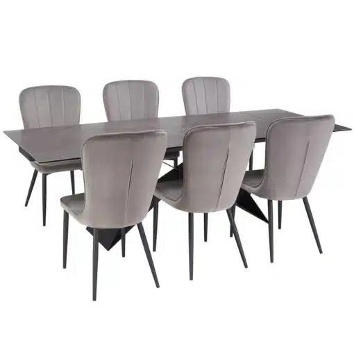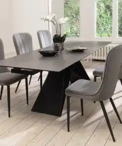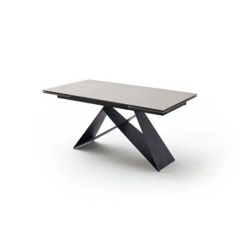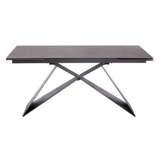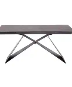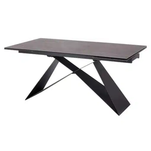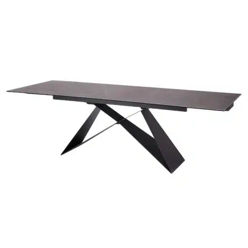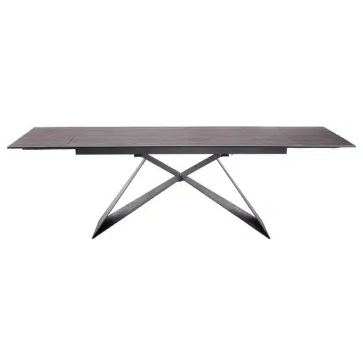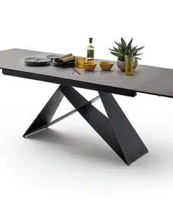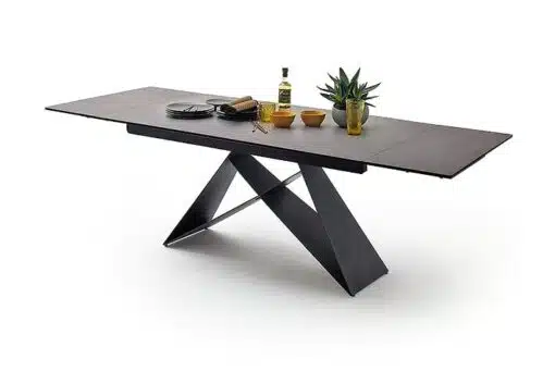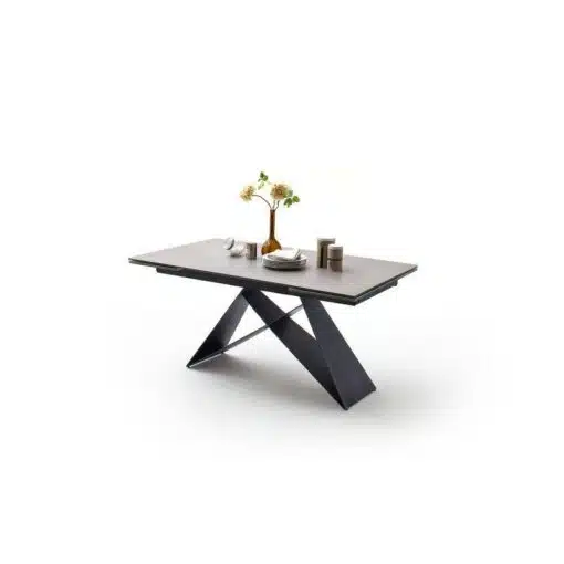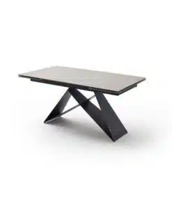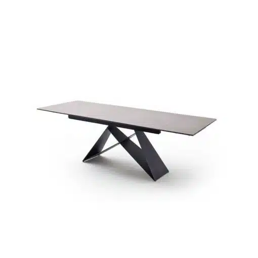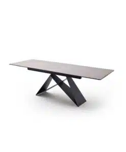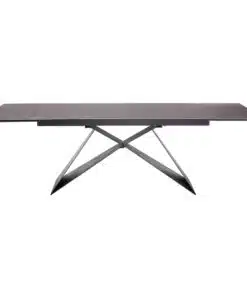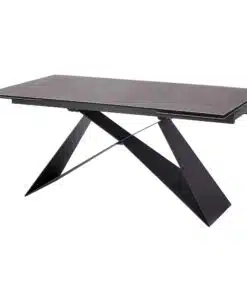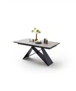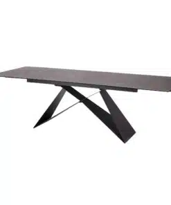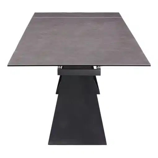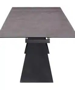 שולחן פינת אוכל מעוצב נפתח , מסגרת השולחן עשויה ממתכת אל חלד בצביעה אלקטרוסטטית איכותית , פלטת השולחן עשויה מקרמיקה בצבע אפור בעובי של 8 מ"מ . השולחן נפתח בכל צד ומתאים ל-10 סועדים במצב פתוח.