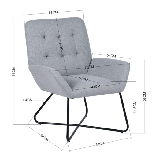 כורסא מעוצבת אפורה בבד איכותי נעים וקל לניקוי , מרופדת בספוג בצפיפות גבוה המבטיח עמידות ונוחות לאורך זמן. רגלי הכורסא עשויים מתכת אל חלד חזקה ויציבה בצבע שחור.