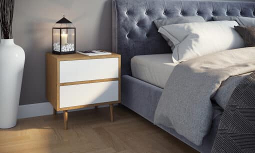 שידת צד מעוצבת לחדר השינה עשויה מעץ מתועש עם חיפוי מלמין בגוון אלון משולב לבן