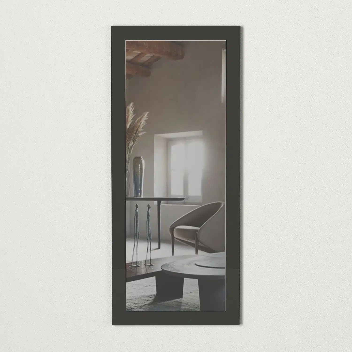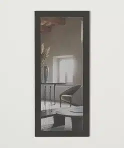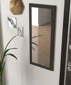 מראה מעוצבת לכניסה לבית עם מסגרת בגימור שחור , משטח המראה עשוי משבבית דחוסה בעובי 18 מ"מ בחיפוי מלמין בצבע שחור.