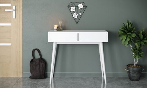 קונסולה לבנה בעיצוב קלאסי וקווים ישרים עשויה מעץ מתועש עם חיפוי מלמין יצוק.