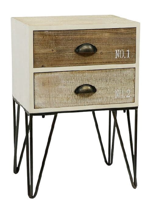 שידת לילה מעוצבת מעץ ומתכת בסגנון רטרו . בעלת שני מגירות אחסון , רגלי השידה עשויות מתכת אל חלד חזקה ויציבה.