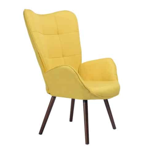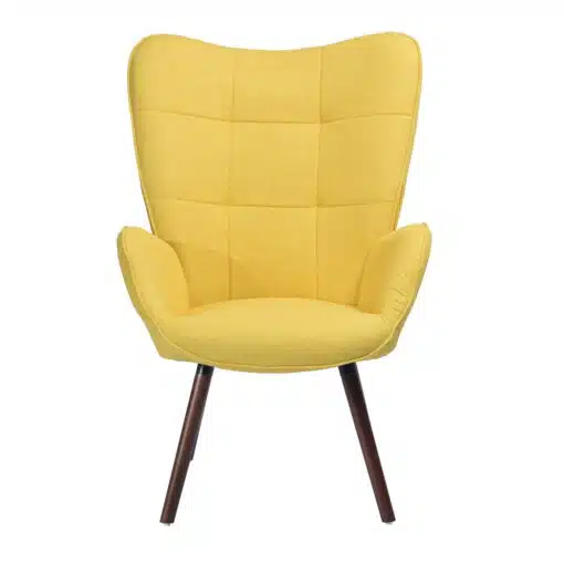 כורסא צהובה מעוצבת מתאימה לסלון לחדר השינה או למשרד. הכורסא נוחה מאוד לישיבה, מרופדת היטב בבד אריג צהוב איכותי ונעים למגע וספוג בצפיפות גבוה המבטיח עמידות ונוחות לאורך זמן, מסגרת ורגלי הכורסא עשויות מתכת אל חלד חזקה ויציבה בגוון עץ טבעי.