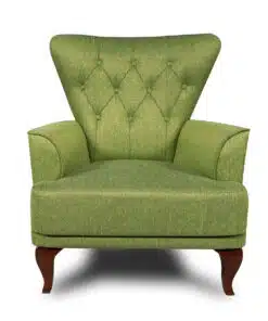 כורסא מעוצבת מרופדת בבד ירוק תפוח עם כפתורים במשענת הגב . הכורסא מרופדת היטב בספוג איכותי עמיד לאורך זמן. המשענת הגבוה מאפשרת תמיכה מלאה לגב לצוואר ולראש. הספה עשויה מחומרים איכותיים מסגרת עץ מלא בד דוחה כתמים ונעים למגע ומערכת קפיצים המבטיחה נוחות לישיבה ממושכת מול הטלוויזיה בקריאה או עם מחשב נייד והטאבלט.