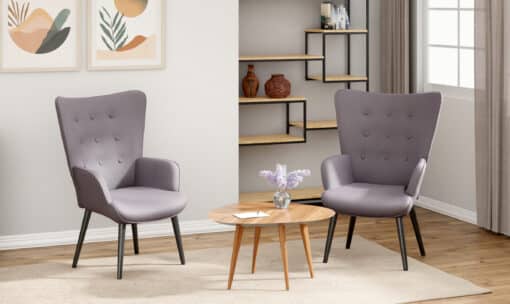 כורסא מרופדת בבד אפור איכותי עם משענת גב גבוה עם כפתורים. רגלי הכורסא עשויות מתכת אל חלד בצבע שחור.