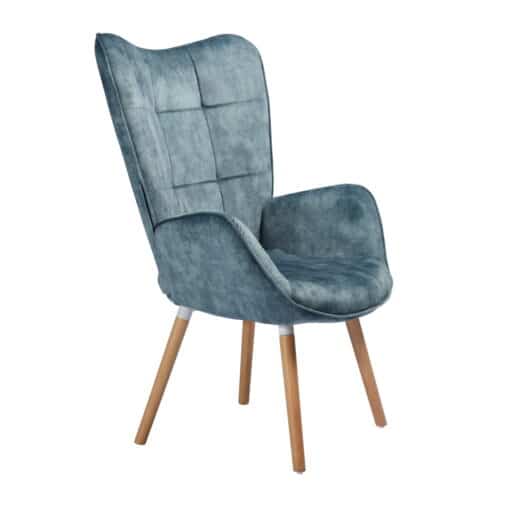 כורסא מעוצבת לסלון מרופדת היטב בבד קטיפתי בגוון תכלת – טורקיז , הספה מרופדת היטב בספוג איכותי עמיד בצפיפות גובה גם רגליים ממתכת בגימור עץ בהיר.