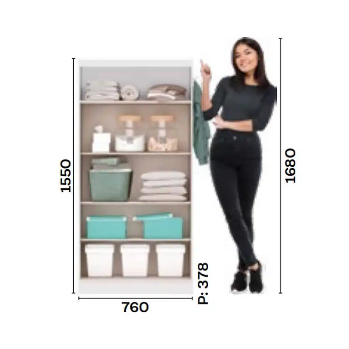 מידות: רוחב 76 ס"מ × עומק 38 ס"מ × גובה 155 ס"מ