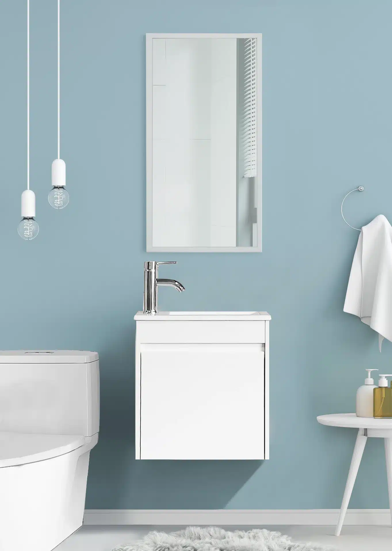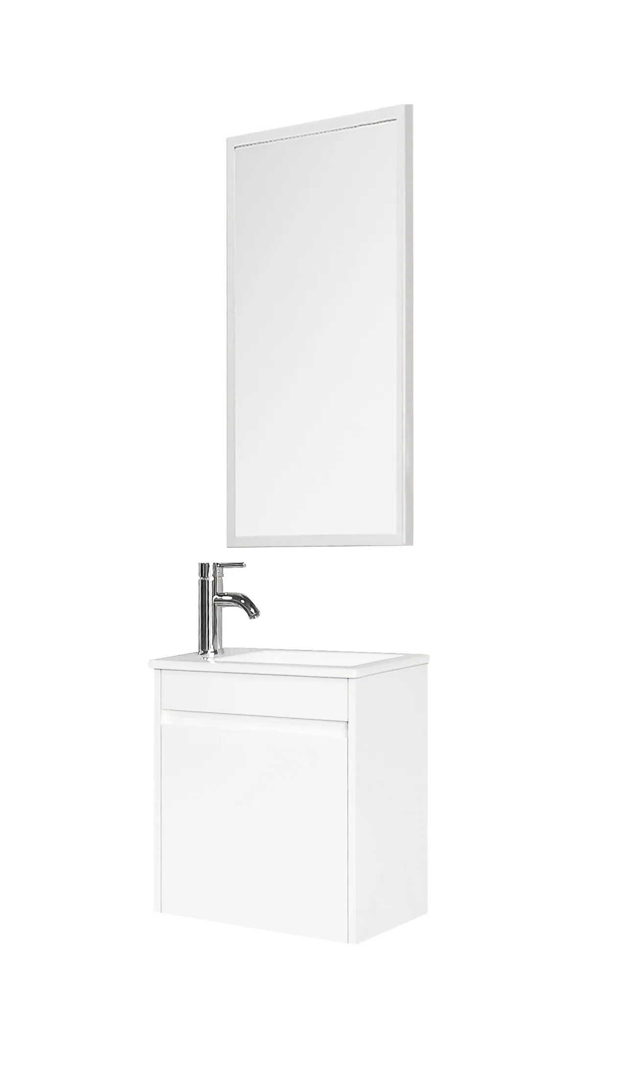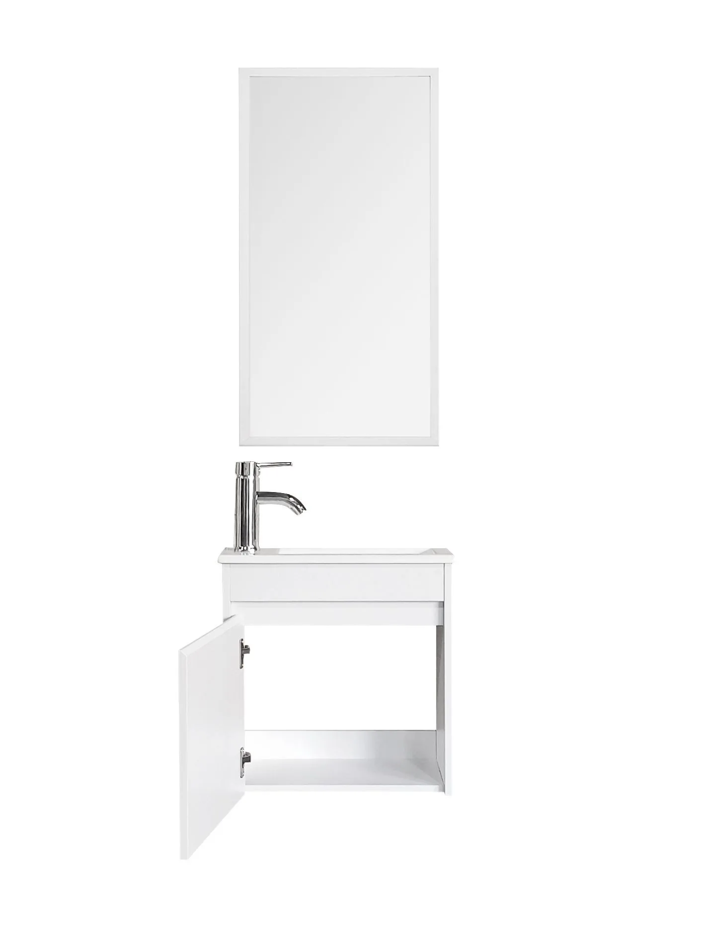 אביזרים כלולים: כיור חרס לבן ומראה עם מסגרת אלומיניום בגימור לבן.