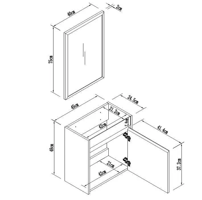 מידות: ארון: 45×24.5×48 ס"מ | מראה: 75×40 ס"מ.