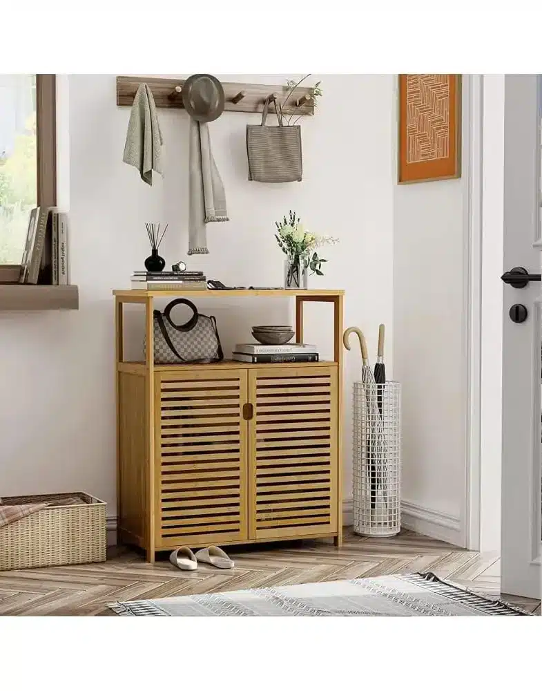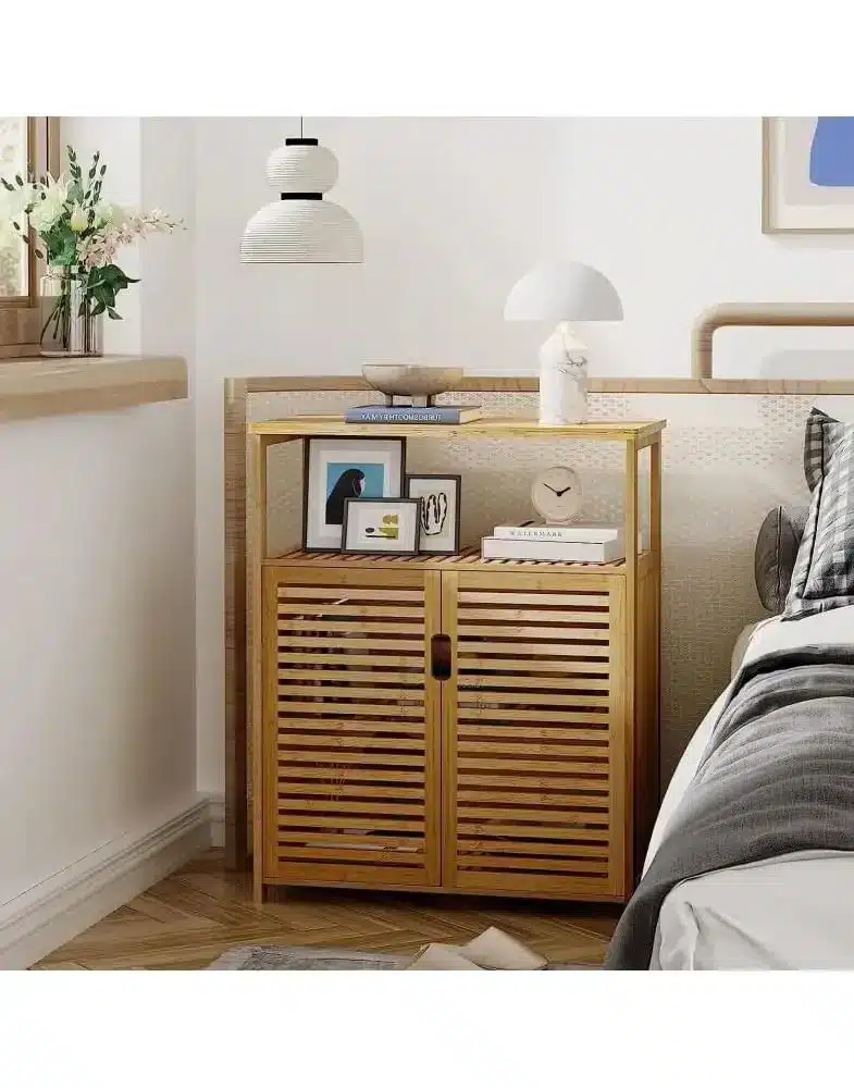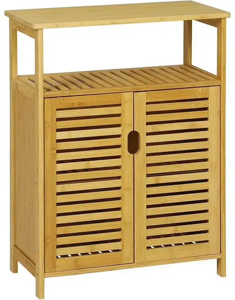 ארון אמבטיה מבמבוק טבעי בעיצוב כפרי מודרני, המעניק פתרון אחסון אידיאלי ושומר על סדר וארגון בחדר הרחצה.