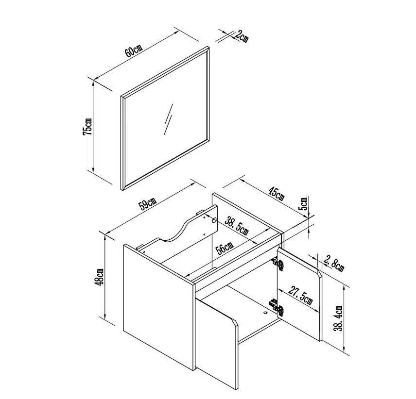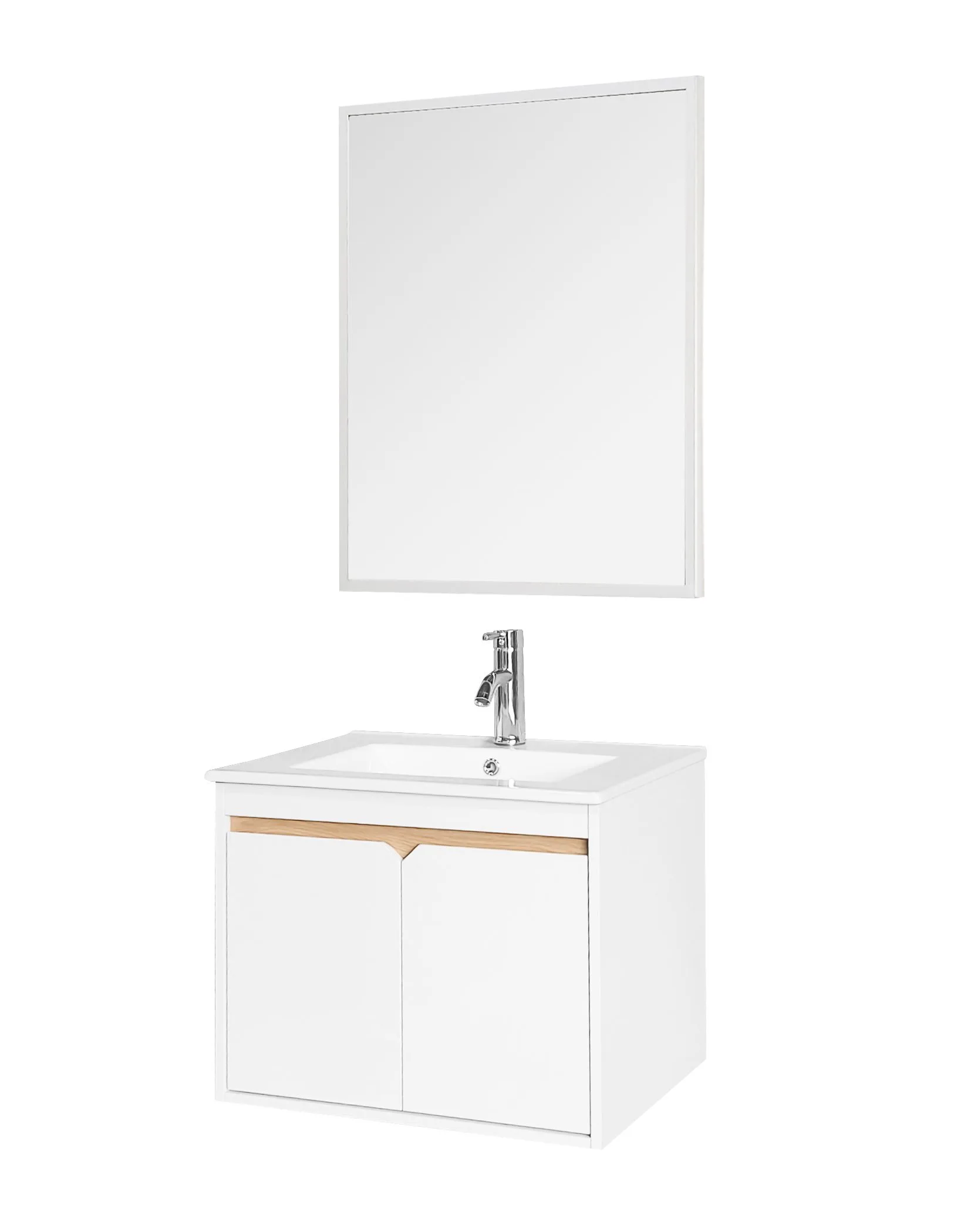 הארון במידות מדויקות של 60 ס"מ רוחב, 48 ס"מ גובה ו-45 ס"מ עומק, מתאים באופן מושלם לחללי רחצה קטנים עד בינוניים. הסט כולל מראה מלבנית מרשימה עם מסגרת אלומיניום אלגנטית במידות 60×75 ס"מ, התואמת באופן מושלם לקווים הנקיים של הארון.